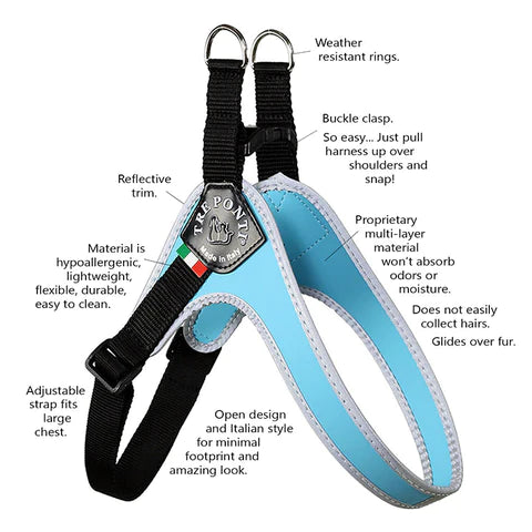 The Genesis Adjustable harness is super easy to use, extremely versatile to fit most small and medium pets, not at all bulky or heavy, and has a stylish design with impermeable, hypoallergenic material and reflective trim. It's a bestseller for a reason! EASY FIT ON AND OFFGenesis Adjustable is truly simple and easy: just step in with the front feet, up over the shoulders, and snap! It’s that easy and that fast to put on and take off. FITS ALMOST ANY SMALL TO MEDIUM PETThe strap that goes under the 'belly' (under the chest) can open and close, which allows the harness to fit even those pets with a small neck and big chest. The harness is accommodating and comfortable! NOT BULKY OR HEAVYThe harness is elegant in its simplicity, with a small footprint on the pet and plenty of room for complete freedom of movement. Not bulky or complicated, but just right. VERSATILEThis harness can be excellent for a wide variety of pets!