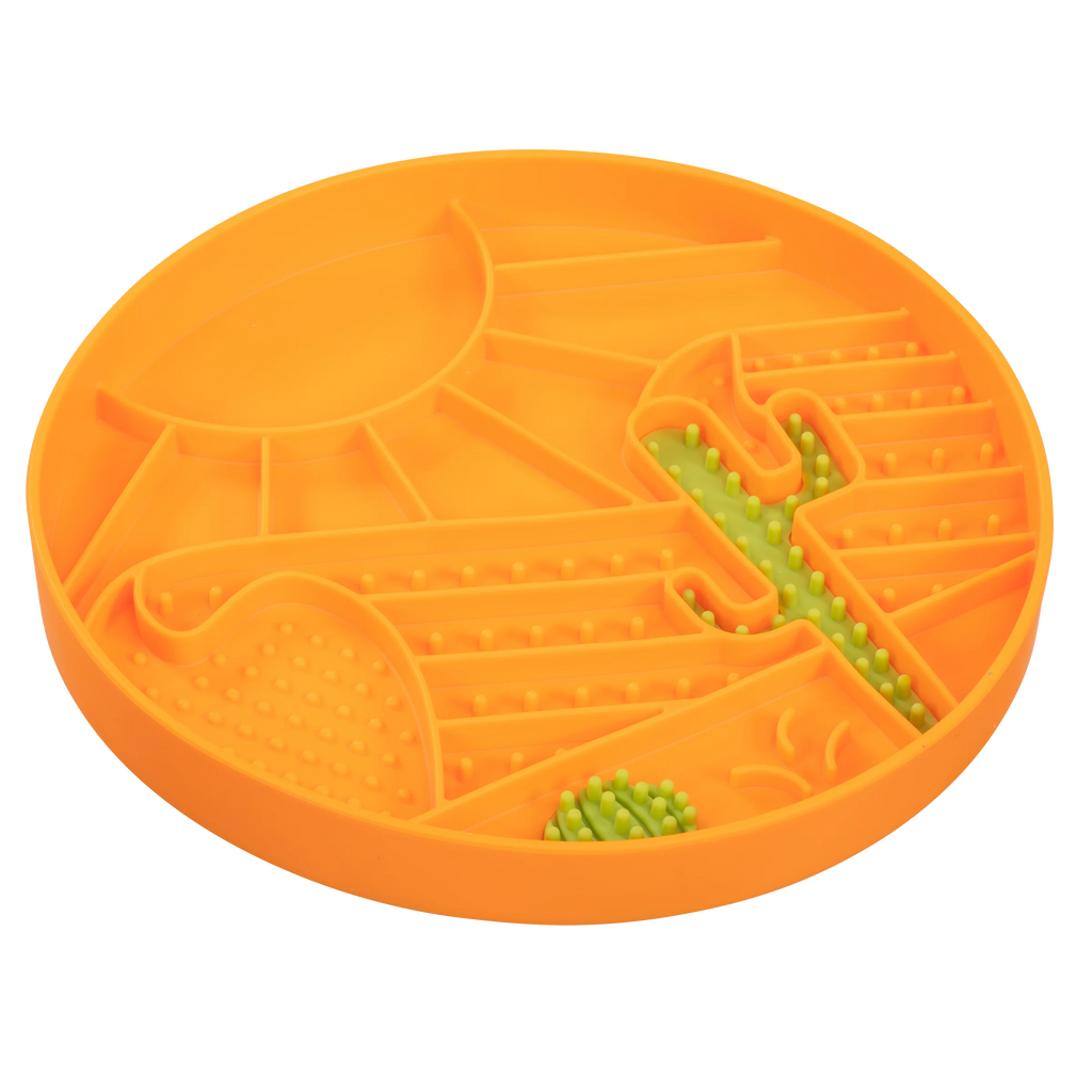 - These mat's textured surface and silicone grooves naturally slow down fast eaters while providing the soothing therapy of licking. Watch your dog enjoy the stimulating challenge of navigating the maze-like design for their food!