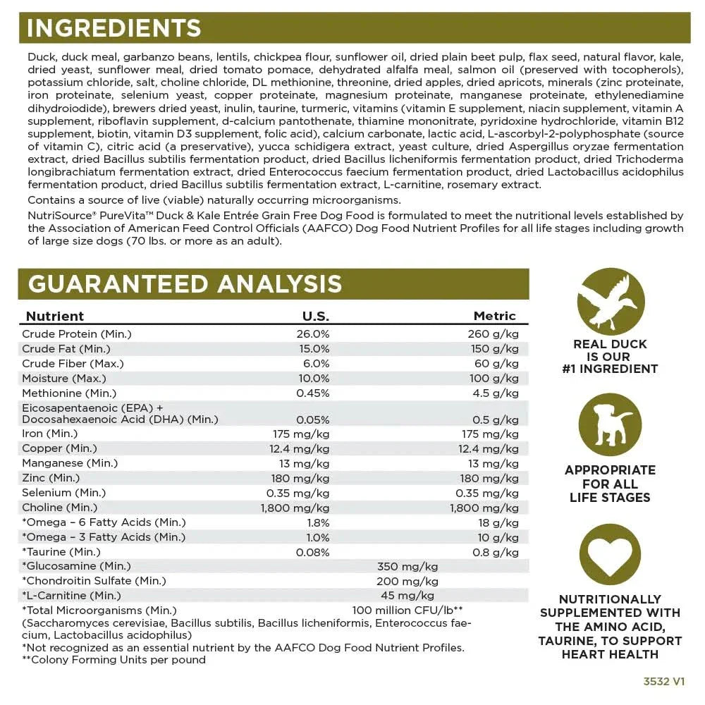 NutriSource® PureVita™ Duck & Kale Entrée Grain Free Dog Food is formulated to meet the nutritional levels established by the Association of American Feed Control Officials (AAFCO) Dog Food Nutrient Profiles for all life stages including growth of large size dogs (70 lbs. or more as an adult).